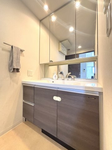 収納面、機能面でも活躍する3面鏡付独立洗面台。鏡の裏は全て収納になっています。化粧品の収納等に役立ちそうですね♪