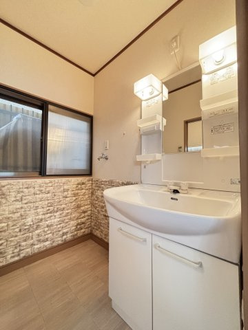 LDK横の独立洗面化粧台は、照明付き・収納棚もたっぷりついています。家族の歯ブラシや、髭剃り・化粧品もらくに取り出せます。