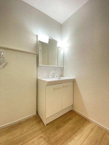 朝の身支度や家事がスムーズに行える広々とした洗面室です。タオルや日用品もすっきり整理可能な収納も充実しており、清潔感あふれる空間です。