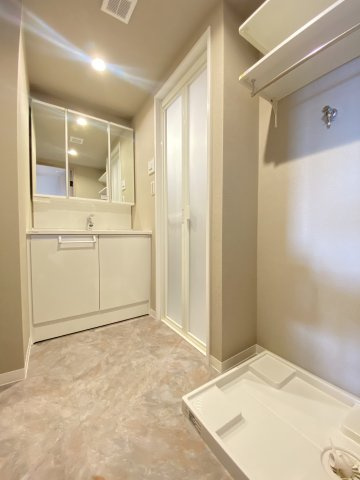身支度からお洗濯まで家事動線に優れたランドリースペース。収納力のある3面鏡も付いていますので、すっきりとお使いいただけます。