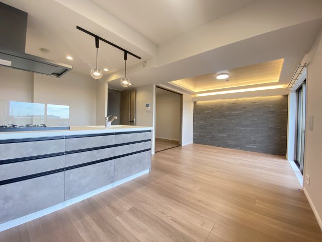 約14.8帖のLDKです。陽当りが良く暖かみのあるリビングは家族の憩いの時間をおだやかに演出してくれます。アクセントクロスには調湿消臭機能のあるエコカラットを採用しております。